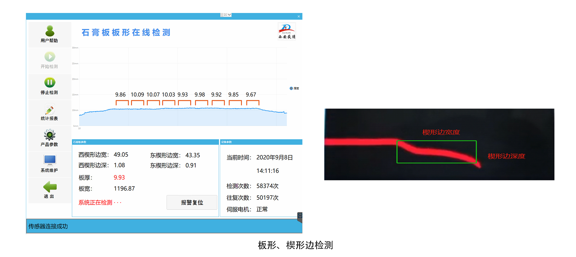 石膏板板形檢測(cè)系統(tǒng):可檢測(cè)石膏板寬度、厚度、楔形邊寬度、楔形邊深度、板長(zhǎng)、對(duì)角線等。
