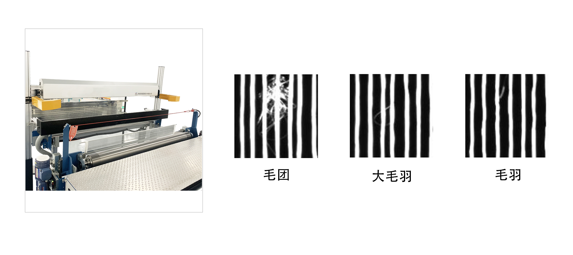 2、可檢測紗線毛羽、毛團,在每根紗線一定長度范圍內(nèi)出現(xiàn)毛羽數(shù)量、毛團面積超出設定值時,進行報警或停機,操作人員可找到對應位置進行處理,以保證經(jīng)線質量。
